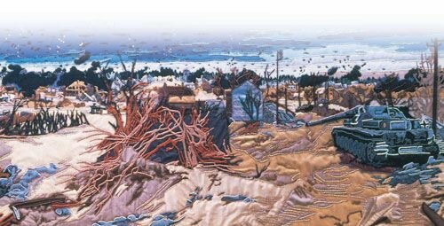 The Embroidery's tone is, naturally, quite patriotic, although some panels do depict Allied casualties in a way which brings home the stark reality of war. It could be argued that certain important events that were not included such as the failed Dieppe Raid, August 1942, in which 1,027 Canadian troops lost their lives in a landing exercise that taught D-Day commanders important lessons should have been, although with space at a premium, the composition is always likely to stimulate debate. However, despite these historical discrepancies, the embroidery certainly provides a useful and entertaining learning tool, especially for the young, and there can be no doubt that it represents an outstanding piece of appliqué needlework. In terms of quality, a remarkable consistency has been achieved, although it should be said that some panels are better than others. Compare, for example, the Spitfires on Panel 12 (the addition of bright pieces of cloth on top of the fuselage and cowl make each one appear rather box-like) with the amazing Panel 30, which brilliantly captures the aftermath of the Battle of Caen. Interestingly, Panel 30 was made as an afterthought; originally, there were only 33 panels, but Lord Dulverton felt the difficult and bloody struggle for the strategically important French town should not be left out.