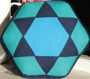 - Tack the fabric over the papers. Using thread matching the darker fabric, RS together, whipstitch the triangles together to form a hexagon. Leave the papers in.